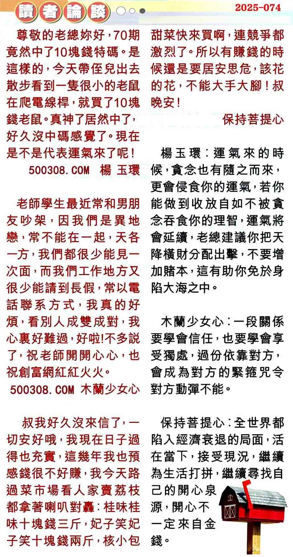 | 主题 :074期:彩民推荐贴信读者论坛 |