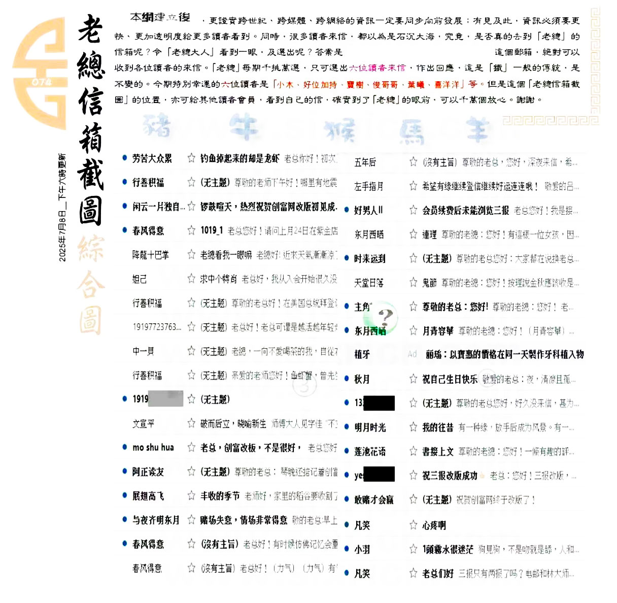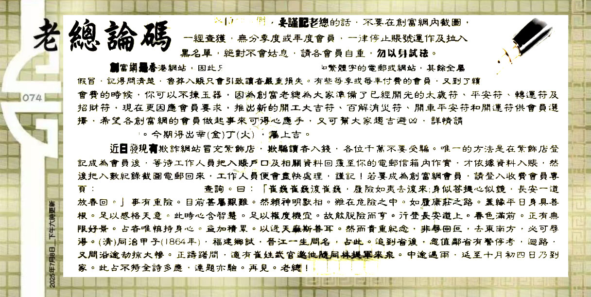 | 主题 :074期:六合皇金句/老总论码/萧公子/林大师/五行夺码/老总信箱截 |