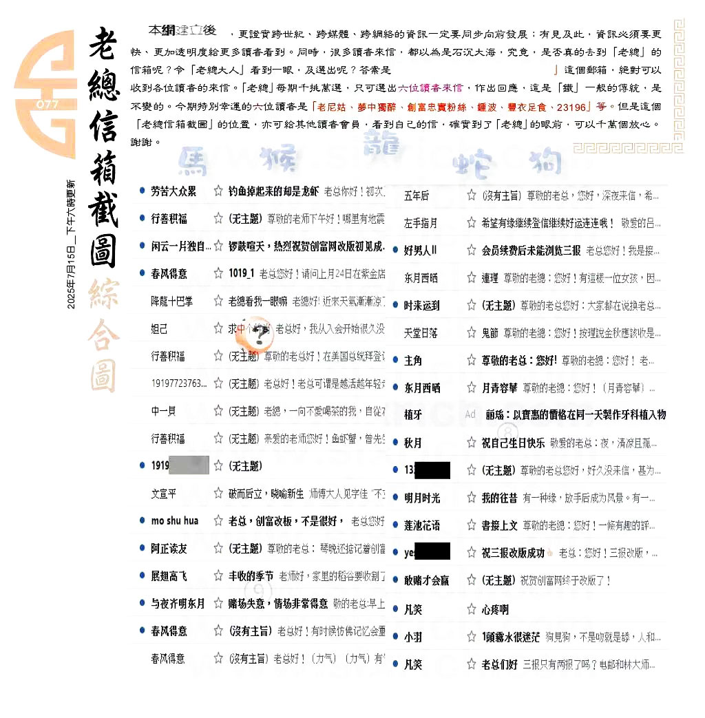 主题 :077期:六合皇金句/老总论码/萧公子/林大师/五行夺码/老总信箱截 |