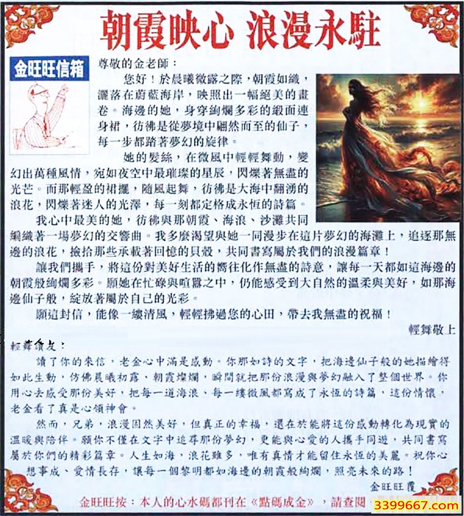 主题 :079期:金旺旺信箱彩民推荐→→《朝霞映心 浪漫永駐》 |