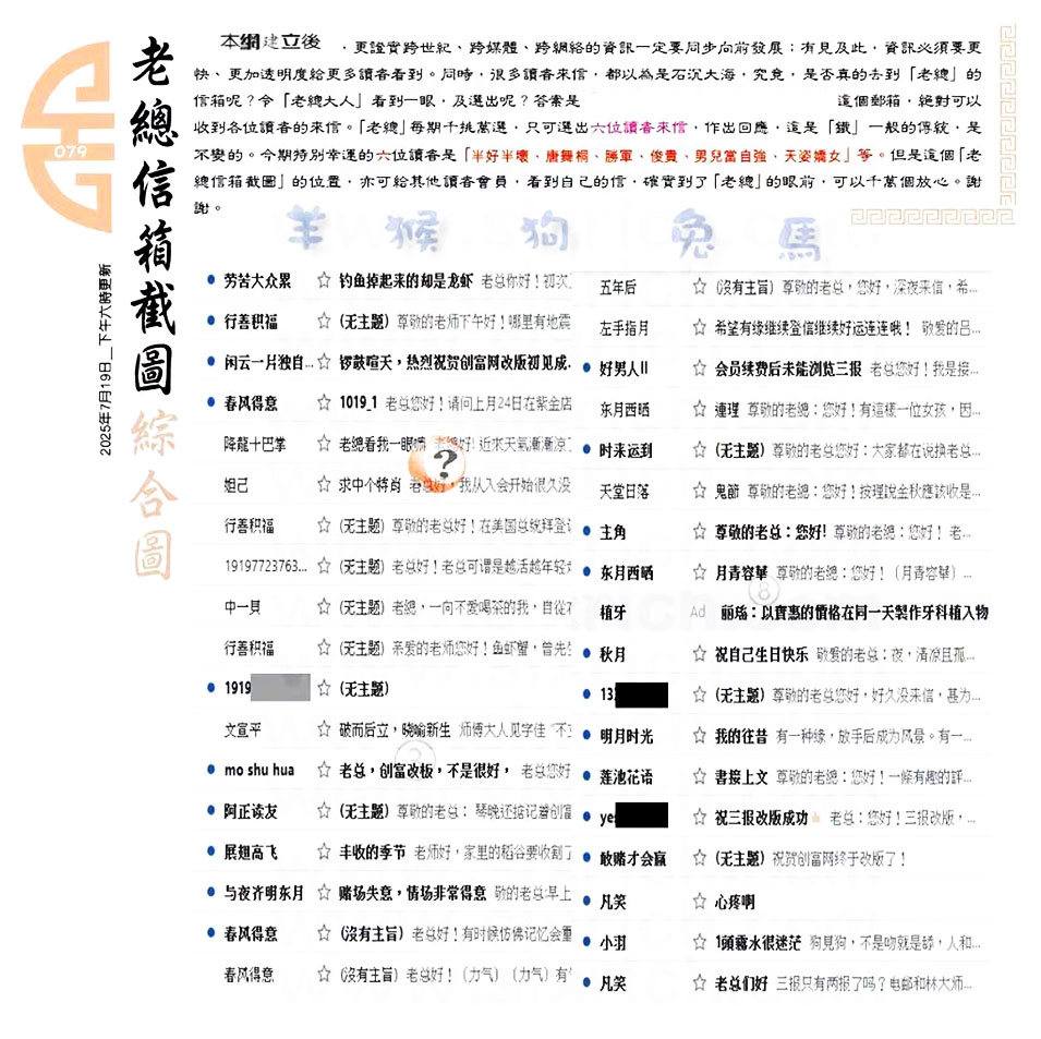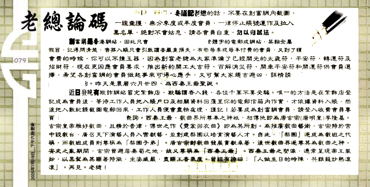 | 主题 :079期:六合皇金句/老总论码/萧公子/林大师/五行夺码/老总信箱截 |