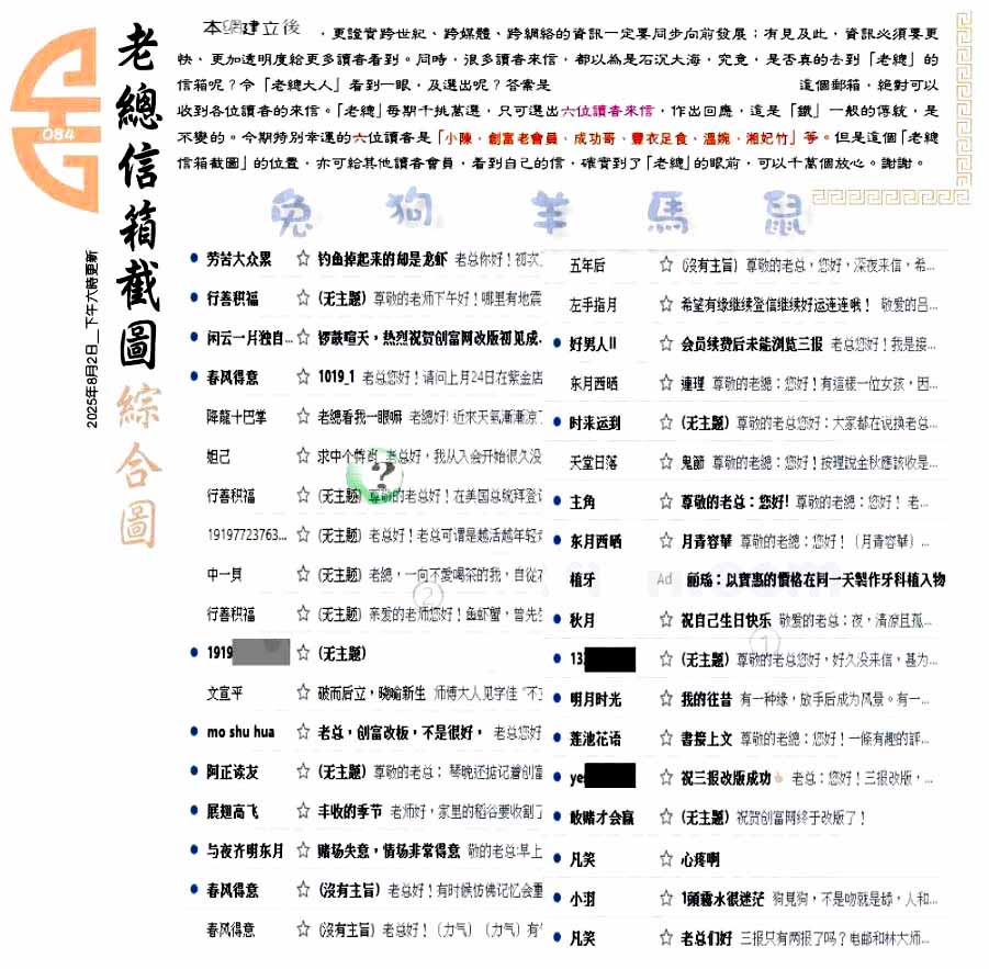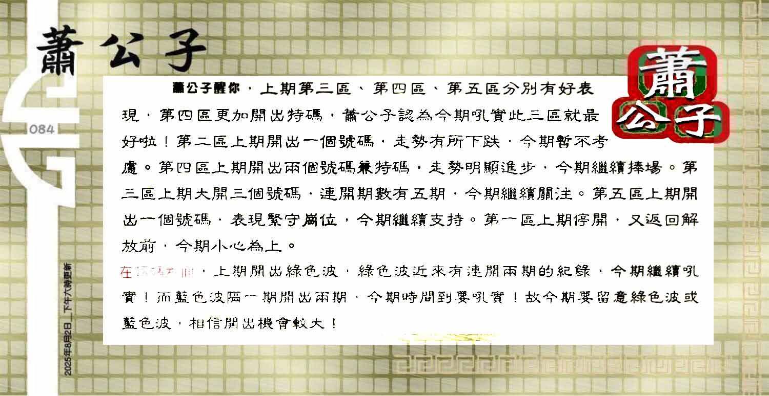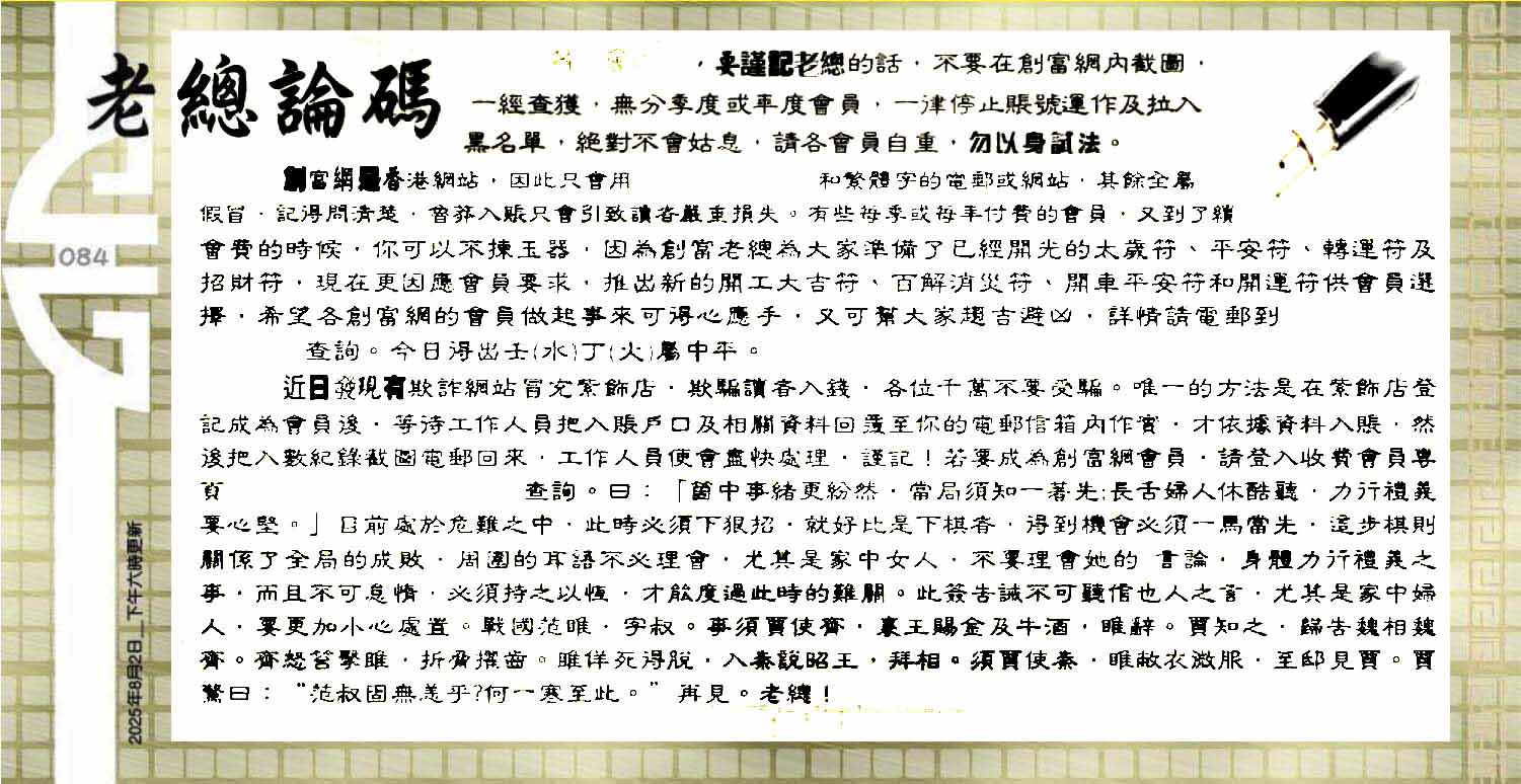 主题 :084期:六合皇金句/老总论码/萧公子/林大师/五行夺码/老总信箱截 |