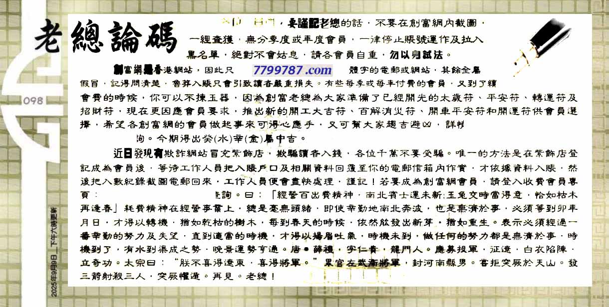 主题 :098期:六合皇金句/老总论码/萧公子/林大师/五行夺码/老总信箱截 |