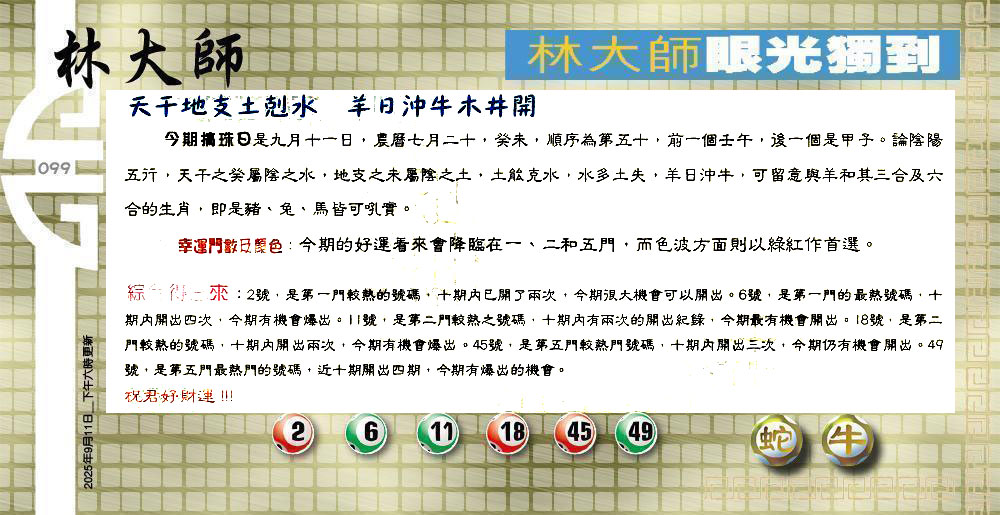 主题 :099期:六合皇金句/老总论码/萧公子/林大师/五行夺码/老总信箱截 |