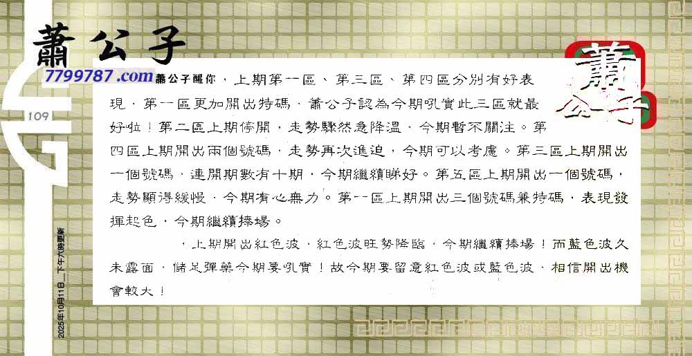 主题 :109期:六合皇金句/老总论码/萧公子/林大师/五行夺码/老总信箱截 |