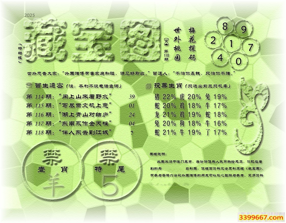| 主题 :118期藏寶圖 新:苏小门前万缕垂 老:伴人东去到江城 禁:羊 禁:5尾 |