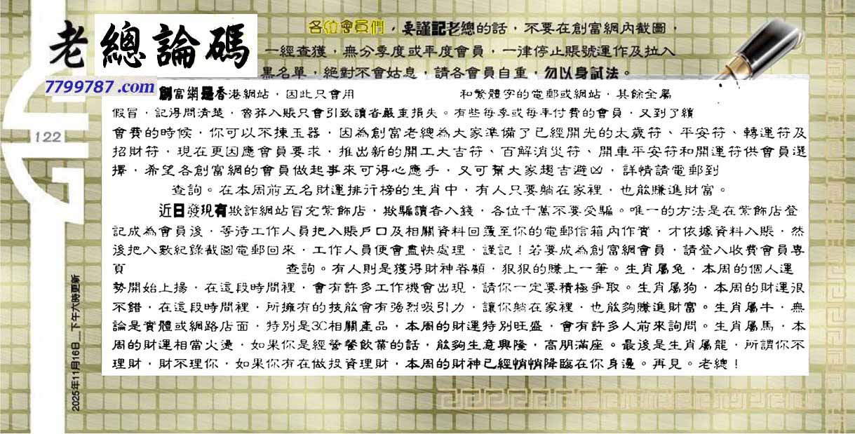 | 主题 :122期:六合皇金句/老总论码/萧公子/林大师/五行夺码/老总信箱截 |