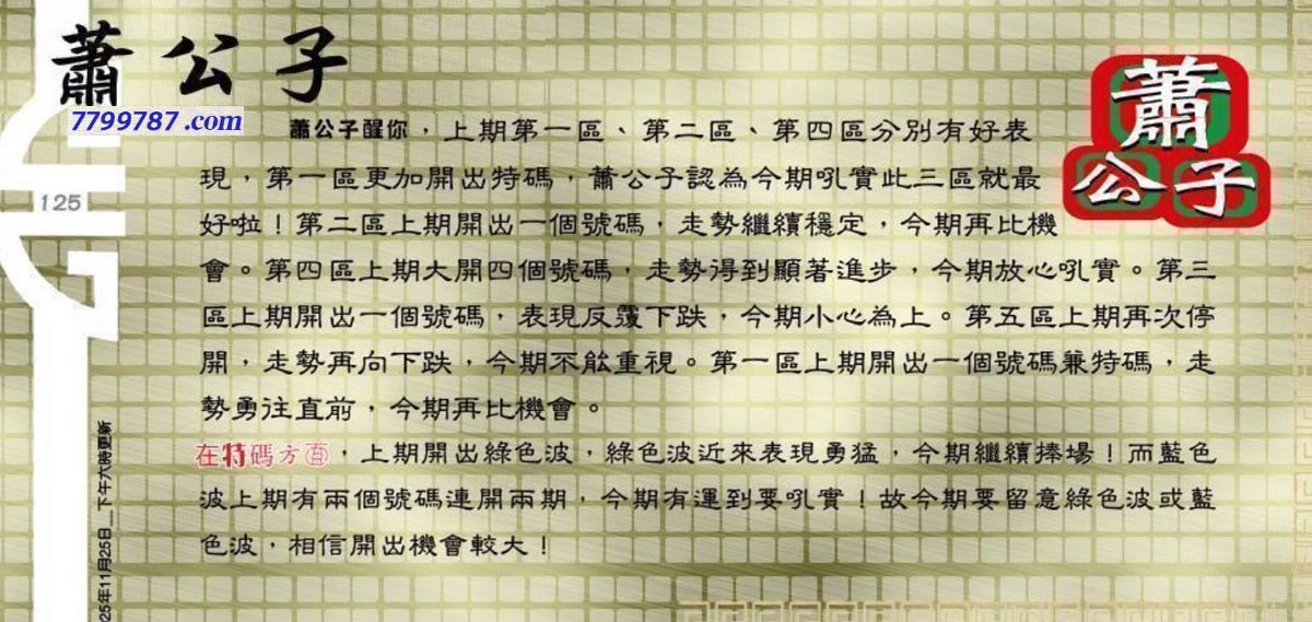 | 主题 :125期:六合皇金句/老总论码/萧公子/林大师/五行夺码/老总信箱截 |