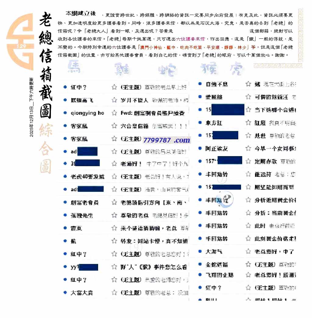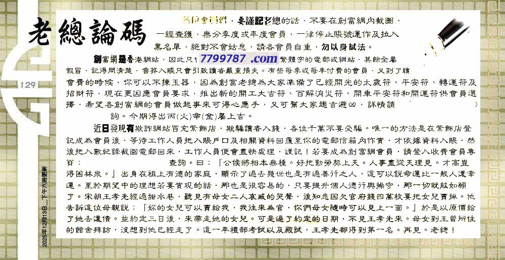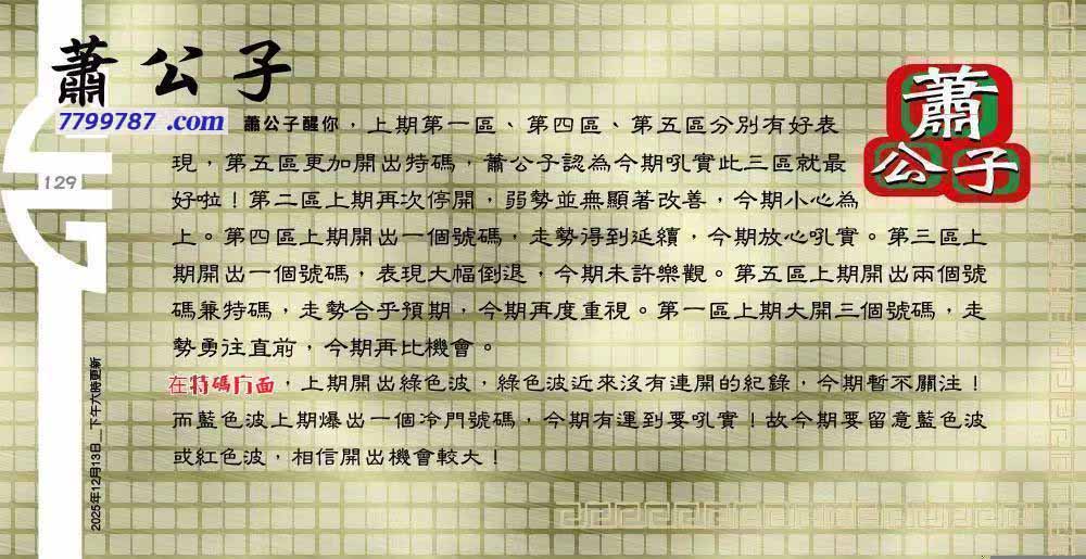 | 主题 :129期:六合皇金句/老总论码/萧公子/林大师/五行夺码/老总信箱截 |