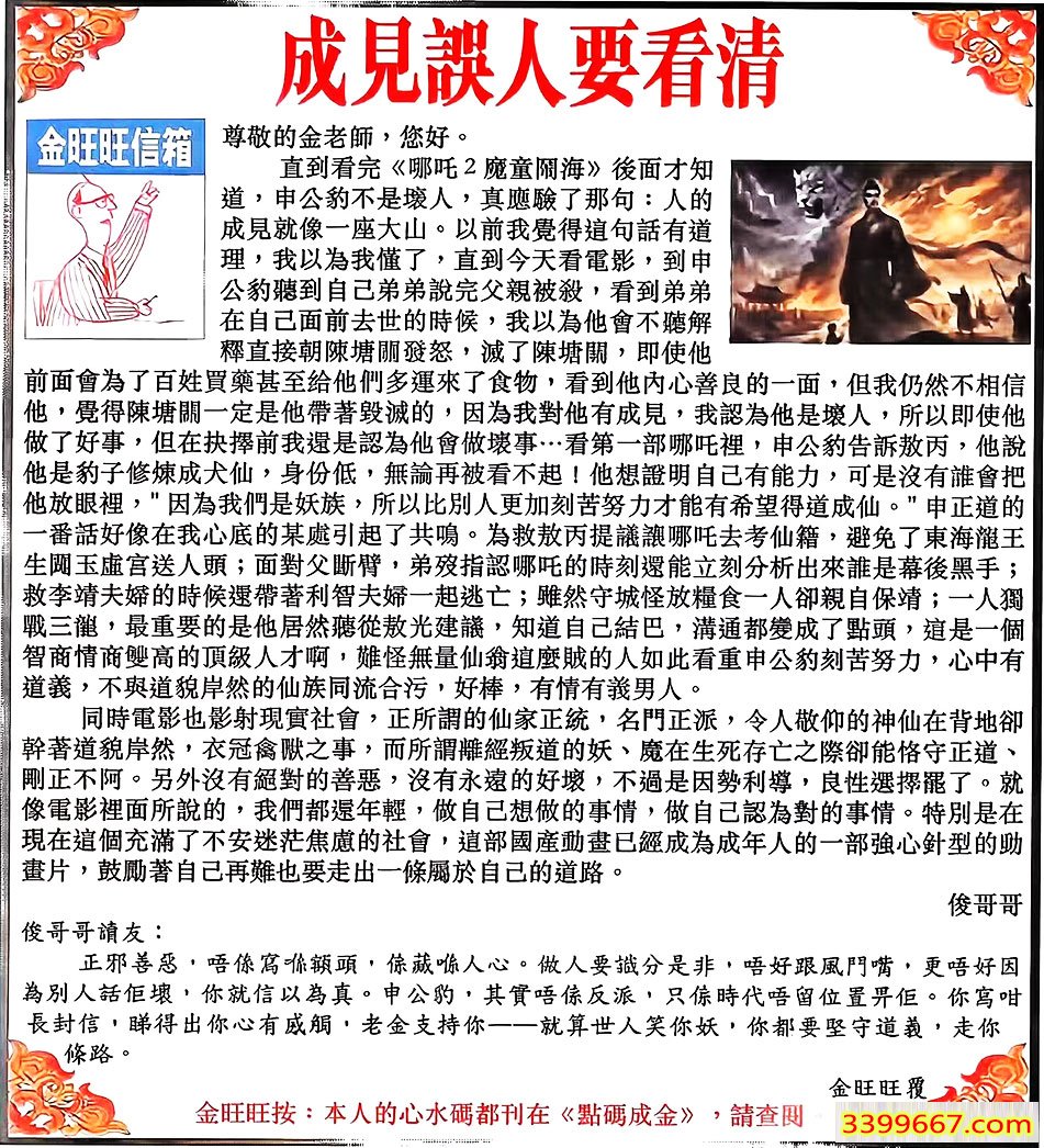 | 主题 :132期:金旺旺信箱彩民推荐→→《成見誤人要看清》 |