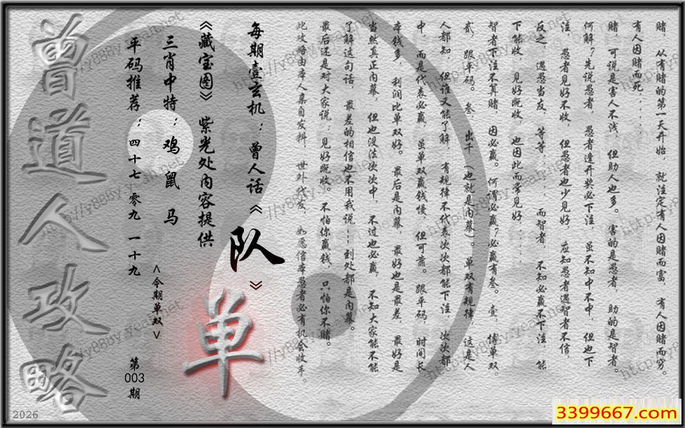 | 主题 :003期藏寶圖 新:君今旧隐治叁泾 老:交游相见休相问 禁:狗 禁:3尾 |