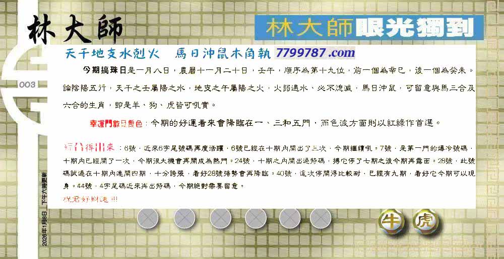 | 主题 :003期:六合皇金句/老总论码/萧公子/林大师/五行夺码/老总信箱截 |